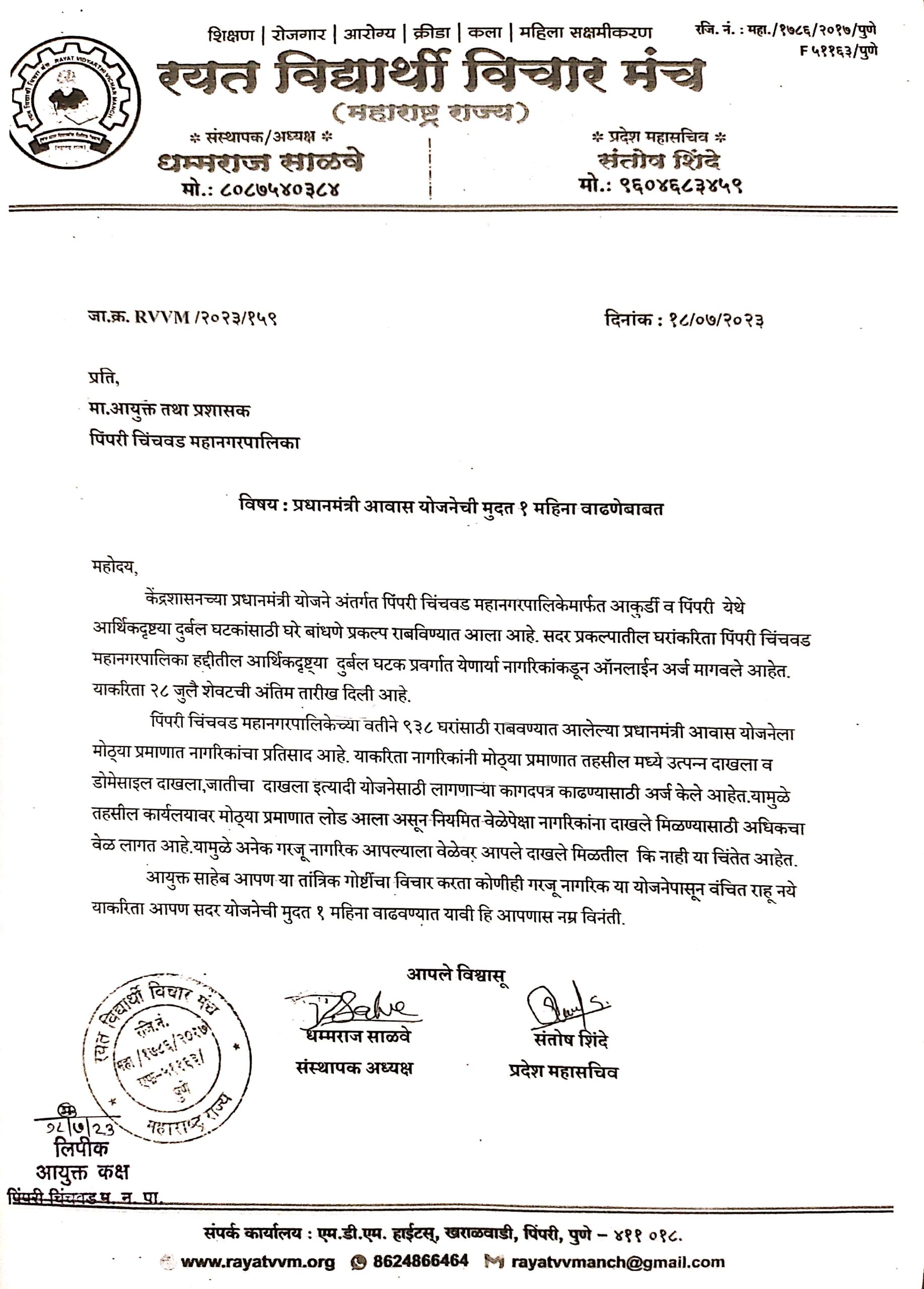 पिंपरी प्रतिनिधी:केंद्रशासनच्या प्रधानमंत्री योजने अंतर्गत पिंपरी चिंचवड महानगरपालिकेमार्फत आकुर्डी व पिंपरी येथे आर्थिकदृष्टया दुर्बल घटकांसाठी घरे बांधणे प्रकल्प राबविण्यात आला आहे. सदर प्रकल्पातील घरांकरिता पिंपरी चिंचवड महानगरपालिका हद्दीतील आर्थिकदृष्ट्या दुर्बल घटक प्रवर्गात येणार्या नागरिकांकडून ऑनलाईन अर्ज मागवले आहेत. याकरिता २८ जुलै शेवटची अंतिम तारीख दिली आहे. पिंपरी चिंचवड महानगरपालिकेच्या वतीने ९३८ घरांसाठी राबवण्यात आलेल्या प्रधानमंत्री आवास योजनेला मोठ्या प्रमाणात नागरिकांचा प्रतिसाद आहे. याकरिता नागरिकांनी मोठ्या प्रमाणात तहसील कार्यालया मध्ये उत्पन्न दाखला व डोमेसाइल दाखला, जातीचा दाखला इत्यादी योजनेसाठी लागणाऱ्या कागदपत्र काढण्यासाठी अर्ज केले आहेत. यामुळे तहसील कार्यलय कामकाजावर मोठ्या प्रमाणात लोड आला असून नियमित वेळेपेक्षा नागरिकांना दाखले मिळण्यासाठी अधिकचा वेळ लागत आहे. यामुळे अनेक गरजू नागरिक आपल्याला वेळेवर आपले दाखले मिळतील कि नाही या चिंतेत आहेत. आयुक्त साहेब आपण या तांत्रिक गोष्टींचा विचार करता कोणीही गरजू नागरिक या योजनेपासून वंचित राहू नये याकरिता आपण सदर योजनेची मुदत १ महिना वाढवण्यात यावी. सदर विषयाचे निवेदन रयत विद्यार्थी विचार मंच संस्थेचे संस्थापक अध्यक्ष धम्मराज साळवे प्रदेश महासचिव संतोष शिंदे यांच्या वतीने पिंपरी चिंचवड महानगपालिकेचे आयुक्त यांना देण्यात आले.