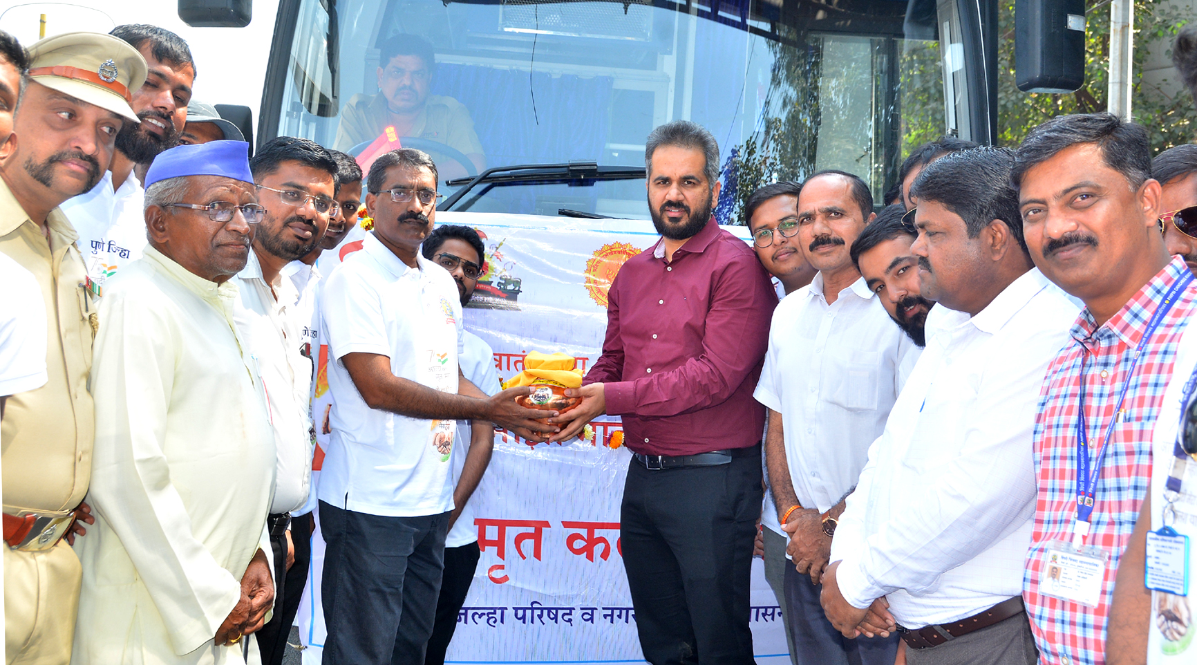 स्वातंत्र्याच्या अमृत महोत्सव अंतर्गत मेरी माटी मेरा देश अर्थात माझी माती माझा देश अभियानामध्ये अमृत कलश घेऊन पुण्याहून मुंबईकडे निघालेल्या अमृत कलश यात्रेचे स्वागत आज पिंपरी चिंचवड महानगरपालिकेच्या वतीने आयुक्त तथा शेखर सिंह यांनी केले. महापालिकेच्या पिंपरी येथील मुख्य प्रशासकीय भवनासमोर झालेल्या या सोहळ्यास अतिरिक्त आयुक्त उल्हास जगताप, मुख्य सुरक्षा अधिकारी उदय जरांडे, उपआयुक्त रविकिरण घोडके, विशेष अधिकारी किरण गायकवाड, कार्यालय अधिक्षक रवी भाट, माजी नगरसेवक माऊली थोरात, सामाजिक कार्यकर्ते प्रा. बी.बी. शिंदे यांच्यासह रथा समवेत असलेले पुणे जिल्ह्यातील विविध ठिकाणचे समन्वयक उपस्थित होते. हा अमृत कलश मुंबई येथून दिल्लीकडे नेण्यात येणार आहे. देशाचे प्रधानमंत्री श्री.नरेंद्र मोदी साहेबांच्या उपस्थितीत दिल्ली येथे दिमाखदार समारंभ पार पडणार आहे.पुणे जिल्ह्यातील विविध शहरांचे प्रतिनिधी अमृत कलश घेऊन मुंबईच्या दिशेने रवाना झाले. महापालिकेच्या वतीने कर्मचारी शिवाजी टिळे आणि मोहित भोसले प्रतिनिधित्व करीत असून ते या रथामध्ये सहभागी झाले आहेत. पुणे जिल्हा परिषद व नगरपालिका प्रशासन, पुणे यांनी अमृत कलश यात्रेच्या समन्वयाची जबाबदारी पार पाडली आहे. आज सकाळी पुणे जिल्हाधिकारी कार्यालय येथून जिल्ह्यातील प्रतिनिधींना घेऊन विशेष बस वाहनातून अमृत कलश यात्रेच्या प्रवासाचा प्रारंभ झाला. ही यात्रा पिंपरी चिंचवड शहरात आल्यानंतर मोठ्या उत्साहात तिचे स्वागत करण्यात आले.