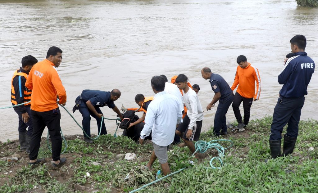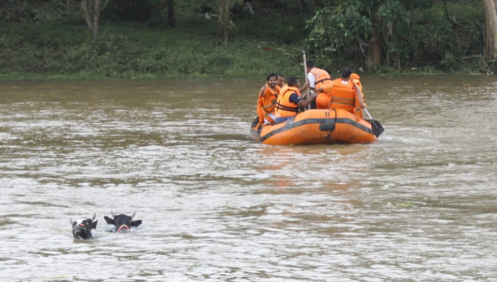 चऱ्होली बुद्रुक येथील इंद्रायणी धाम स्मशानभूमीच्या किनाऱ्याच्या विरूद्ध बाजूला असलेल्या नदीपात्रातील बेटावर गेल्या २ दिवसांपासून ३ गायी अडकून पडल्या होत्या. अतिवृष्टीमुळे इंद्रायणी नदीची पाण्याची पातळी वाढत गेल्याने गायींच्या सुटकेबाबत सर्वजण चिंतीत होते. अशातच महापालिकेच्या आपत्कालीन यंत्रणेला याबाबत माहिती मिळाली. शहरात पूरनियंत्रणासाठी विविध पथके काल दिवसभर विविध ठिकाणी मदत आणि बचावकार्यासाठी अहोरात्र काम करत होती. शहरातील आपत्कालीन परिस्थिती पाहता महापालिका आयुक्त शेखर सिंह यांनी राष्ट्रीय आपत्ती प्रतिसाद दलाशी संपर्क साधून त्यांना शहरात पाचारण केले. शहरातील विविध ठिकाणी या दलाच्या तुकडीने मदतकार्य करत बचावकार्यात महत्वाची भूमिका बजावली. आज चऱ्होली येथील नदीपात्रातील बेटावर अडकलेल्या गायींची सुटका करण्यासाठी राष्ट्रीय आपत्ती प्रतिसाद दलाने मोहीम हाती घेतली. महापालिकेचे अग्निशमन दल, पोलीस दल, आपत्कालीन परिस्थितीत काम करणाऱ्या विविध स्वयंसेवी संस्था आणि स्थानिक नागरिक यांनी संयुक्तपणे बचावकार्य सुरू केले. सुमारे तीन तास चाललेल्या या बचावकार्यात राष्ट्रीय आपत्ती प्रतिसाद दल, महानगरपालिकेच्या अग्निशमन दलाच्या जवानांनी अत्याधुनिक सुसज्ज उपकरणांसह ३ बोटी आणि दोरखंडाच्या सहाय्याने गायींना सुखरूप नदीकाठी आणले आणि सर्वांनी सुटकेचा निःश्वास सोडला. अग्निशमन दलाचे दोन वाहने, राष्ट्रीय आपत्ती प्रतिसदा दलाची ३ वाहने घटनास्थळी तैनात करण्यात आली होती.